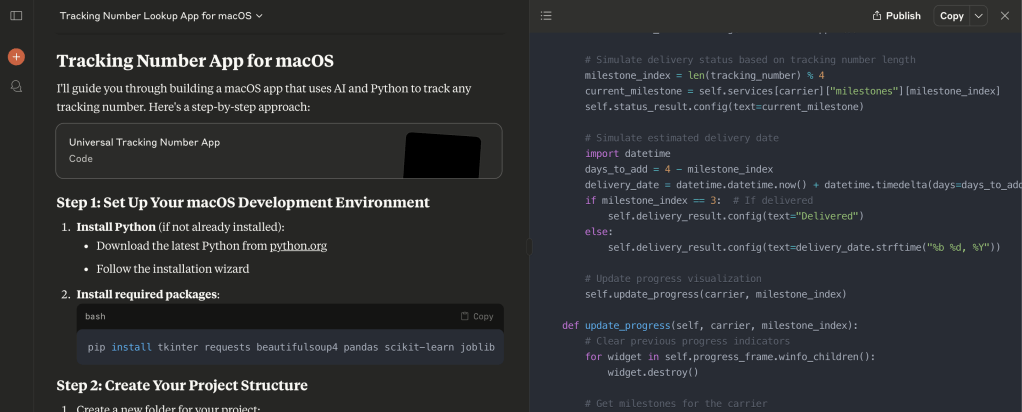“for MAC OS, give me step-by-step instructions on building an app that tracks any tracking number via AI & Python. User should give any tracking number, App should look for a website to track it, and then suggest the delivery milestone.”