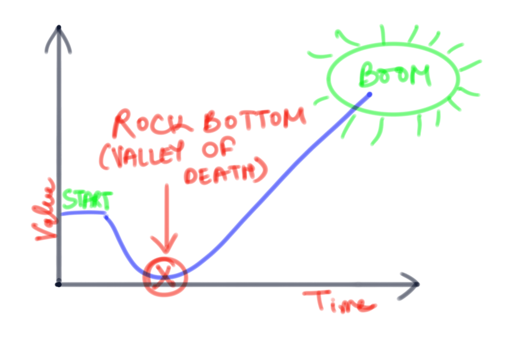 If you’ve ever watched a “How I Made $10K in My First Month on Etsy” video, you know the vibe: exciting music, energetic editing, and a promise that success is just a few clicks away. But behind the scenes, things are very different. It doesnt show the different failed businesses the youtuber must have had to get to the first 10K. I was naive to have beleived it comes easy. Everyones story is different. Everyone has the below curve in entreprenuership. So you need to have the appetite to hit rock bottom before an exponential boom. So if you are ready to endure it, go for it.